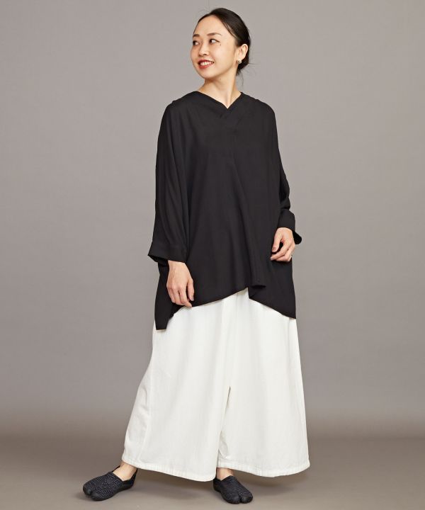 長めのチュニック丈で体型カバーもでき、正面から見るとシンプルな印象の無地で、着回しやすさも◎着物の重ねのような衿元でモダンな和の装いに。