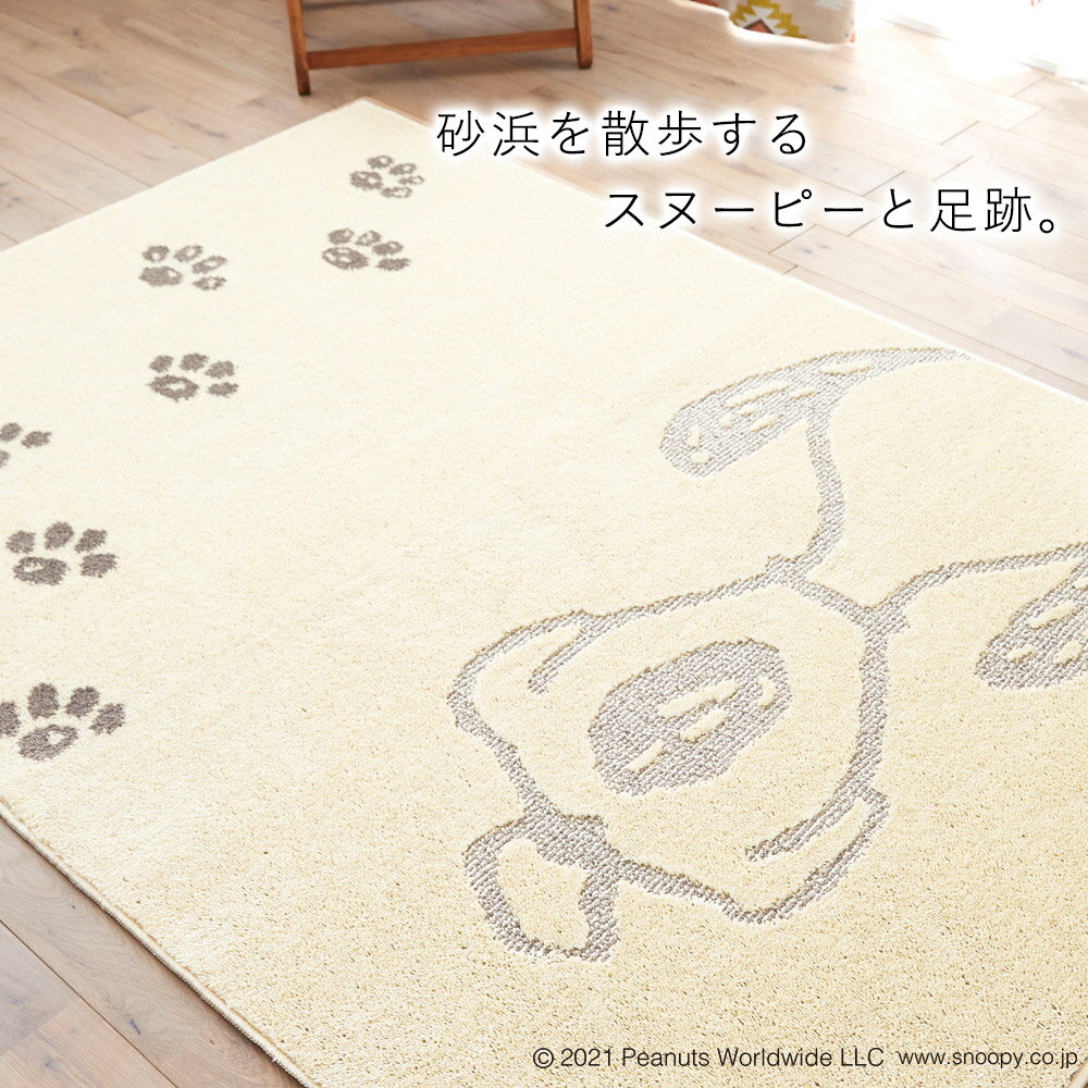 商品詳細 砂浜を散歩するスヌーピーと足跡がかわいいラグ。