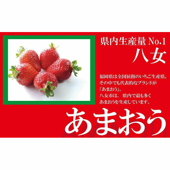 商品詳細 名称 いちご(あまおう) 商品概要 ■いちご県内生産量No.1の福岡八女からお届け!■ 八女エリアは福岡県内でもいちごの生産量がNo.1! 一粒一粒がおひさまの光をたっぷり浴び、あかく、まるく、おおきく育った 福岡限定いちご「あまおう」が主な品種です。