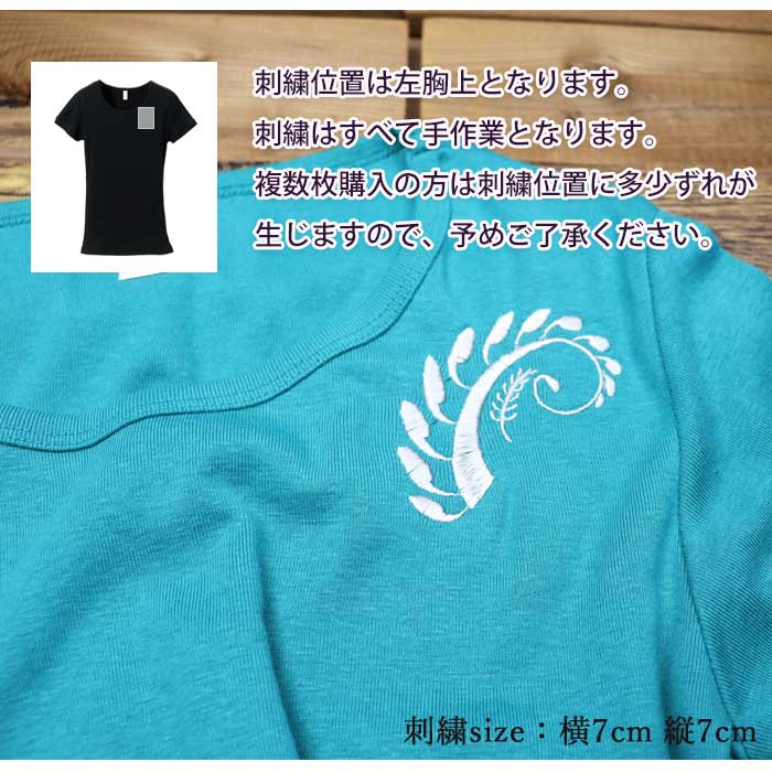 商品名ボタニカルなモチーフ!6.2オンス CVC フライス Tシャツ素材綿70%、ポリエステル30%サイズS M L XL カラーアップルグリーン原産国Tシャツ:中国 刺繍:日本おすすめポイント〇ボディラインにフィットし、女性らしさが光るフライスTシャツ。