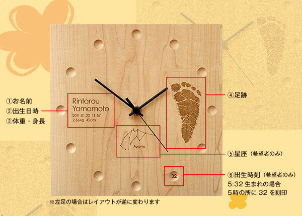 今しかとることのできない赤ちゃんのちいさなちいさな足あと、赤ちゃんのはじめのいっぽをそのまま木製時計にしませんか? 小さな足型が刻印された世界に一つだけのオーダーメイド品です。