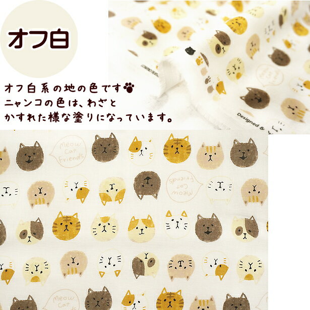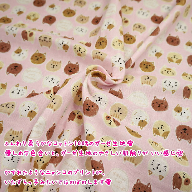 ダブルガーゼ 生地 にゃんこフレンズ 猫の顔柄 猫 Wガーゼ 綿100% 布 手芸 ガーゼ 生地 ニャンコ cat friends 赤ちゃん スタイ マスク マスク作り