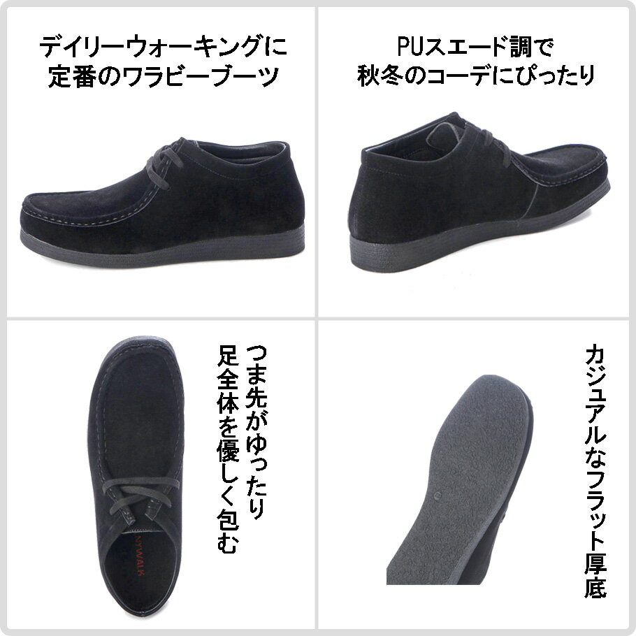 当社オリジナル マスク 入荷! 同梱出荷出来ます! 20枚袋入 50枚箱入 デイリーウオーキングシューズとして昔から好評を博したワラビブーツ ワラビーブーツとは、カンガルーの小型有袋類ワラビーから命名されました 子供をお腹に入れて大事に育てるように、足を優しく包み込みような1足です つま先を締め付けすぎないゆったりとしたオブリーク木型で、リラックスした履き心地を実現 スエード調PUレザーを使用し、オールシーズン、とりわけ秋冬のコーデにぴったり 足全体を包むような形状や、しっかりと厚みのあるアウトソールがコンフォートな履き心地を実現しました コスパ抜群、オススメの1足です ■商品仕様■ 弊社オリジナルブランド:ANYWALK エニーウォーク サイズ(cm):24.5/25.0/25.5/26.0/26.5/27.0/27.5/28.0 甲周り:3E (幅広) カラー:ブラック (BLACK) / キャメル (CAMEL) 片足重量:約371g (26.0cmの場合) 甲材:PUレザー(スエード調) 底材:合成底 企画製造:日本でオリジナル企画、中国で委託生産 ※写真を見るモニターやブラウザによって、実際の商品と若干の色の違いがある場合がございます。